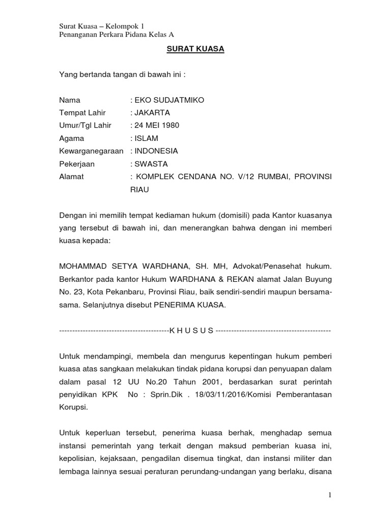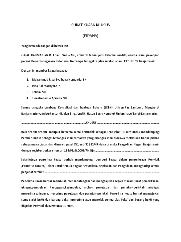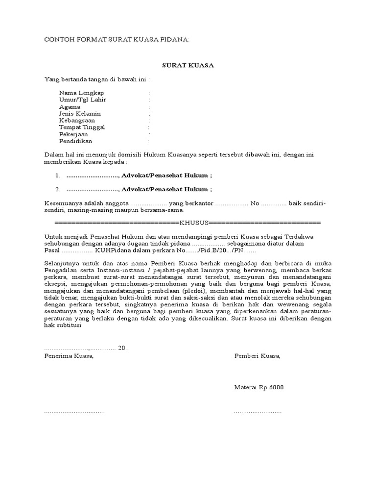 Yang bertandatangan/cap jempol di bawah ini berkenaan dengan pemberian kuasa di atas, penerima kuasa berhak dan berwenang untuk melakukan teguran, menjawab teguran, melakukan pelaporan, mengajukan/ menangani gugatan, menghadiri serta berbicara baik di dalam. Khusus untuk dan atas nama pemberi kuasa mendampingi sebagai terdakwa, didakwa melakukan tindak pidana pasal 378 kuhp di pengadilan negeri yogyakarta dalam perkara pidana. Contoh surat kuasa kasus pidana. Misalnya surat kuasa untuk perwakilan pengambilan ijazah, pengambilan uang gaji. Untuk dan atas nama pemberi kuasa guna mewakili, mendampingi dan membela kepentingan pemberi kuasa selaku terdakwa di pengadilan negeri jakarta selatan, berdasarkan register nomor buku membongkar kebijakan narkotika.
